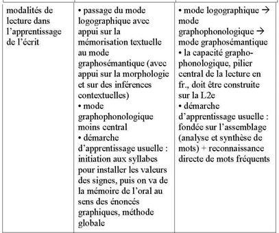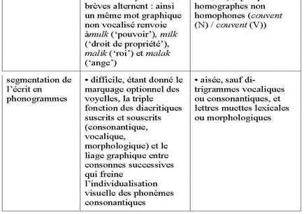 Comme le montrent les études expérimentales sur la reconnaissance du mot écrit en arabe par des adultes (Grainger et al. 2003) et sur le traitement du mot en français L2 par des arabophones comparés à des lusophones (Besse, Demont et Gombert, 2007), on doit retenir, pour mettre en place une didactique de l’écrit en français L2e (langue à alphabet latin) après l’arabe L1e du domaine sémitique, les contrastes suivants du traitement du mot :