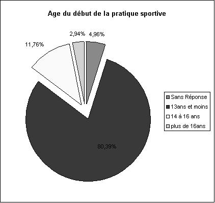 Pour ne pas contredire les faits, l’institution scolaire a été comme un lieu privilégié du début de leur pratique. Elle a fonctionné comme le pourvoyeur des apprentissages théoriques et corporels. Ainsi, 80% ont commencé le sport à 13 ans et moins, 12% entre 14 et 16 ans et 3% à plus de 16 ans.