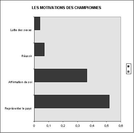 Il a été demandé aux championnes de procéder au classement de huit propositions qui ont été choisies en référence aux motivations intrinsèques et extrinsèques. Les résultats présentés dans ce tableau et dans l'histogramme montrent les pourcentages obtenus à chaque fois qu'une proposition s'est classée au premier rang.