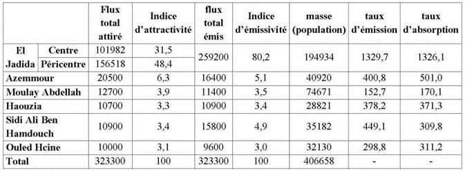 Tout en étant dans une logique de symétrie des flux, il est important d’examiner l’émissivité des lieux d’origines. En fait, El Jadida est aussi la commune la plus émettrice des flux, son indice atteint 80,2, dont plus de la moitié est canalisée par les quartiers du péricentre. Du point de vue de la capacité d’absorption et d’émission, qui est liée à la masse (population) de chaque objet (commune), El Jadida fait preuve d’une importante capacité d’émission et d’absorption, exprimée par des taux respectivement de 1329 et 1326 pour mille habitants. En ce qui concerne la ville d’Azemmour, bien que son indice d’émissivité se rapproche de celui des autres communes de la périphérie, elle dispose d’une capacité d’émission et d’absorption nettement importante, respectivement de 400 et 501, loin des autres communes, ce qui lui confère la deuxième position après El Jadida.