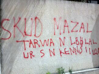 La question linguistique est également omniprésente dans le paysage graffitique de Tizi-Ouzou. Plusieurs graffiti sont écrits en kabyle et transcrits dans la graphie latine. En effet, le système de transcription tifinagh est peu visible sur le terrain de nos investigations, sauf pour des fins symboliques et esthétiques. Les messages écrits en kabyle (en graphie tifinagh ou latine) matérialisent, du point de vue de la forme et du contenu, un « marquage identitaire » (Ouaras, 2015) et une valorisation de Soi. Pour Calvet, « la forme de la langue est ici le lieu d’une quête identitaire » (Calvet, 1999, p. 13). Le recours au kabyle dans le graffiti sert essentiellement à mettre en évidence l’identité amazighe et les spécificités de la culture régionale.