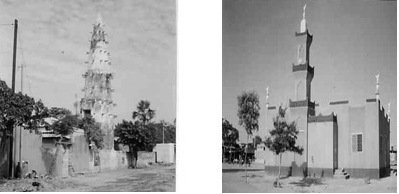 Les musulmans des zones non loties ou des villages rattachés[8] qui veulent édifier une mosquée demandent tout d’abord l’accord des chefs traditionnels et des propriétaires terriens avant toute démarche administrative. Dans les zones loties, cette condition est de moins en moins respectée. Les musulmans envoient directement leurs demandes aux autorités administratives. Toutefois, les chefs des villages et propriétaires terriens sont informés par courtoisie, leur accord est même sollicité car le mécontentement de la population peut retarder l’obtention d’un terrain ou d’une autorisation de construire. En 1973, les sunnites étaient reconnues par les autorités comme une association religieuse, et ayant le même droit que la Communauté Musulmane, mais l’opposition de celle-ci et celle des habitants du quartier Zangouettin ont fait qu’ils (les sunnites) ont passé plusieurs années à la recherche d’une autorisation de construire. La condition de l’autorisation de construire existait depuis la période coloniale. Quand les musulmans de la colonie de la Haute Volta[9] voulaient bâtir leur mosquée de Ouagadougou ils ont adressé deux demandes aux autorités coloniales sous couvert du Moog Naaba Saaga. La première, datée du 15 septembre 1950, demandait l’attribution d’un terrain (celle-ci était aussi une demande d’autorisation de construire), et la seconde faite le 22 décembre 1951, demandait une aide à construire. Ces doléances ont été acceptées. Un terrain de 5.000 m2 et une somme d’un million de francs CFA leur ont été accordés[10]. Depuis, la création de la Communauté Musulmane en 1962[11] qui regroupait tous les musulmans de toutes tendances, le Ministère de l’Intérieur et de la Sécurité prenait l’avis de cette structure avant de délivrer une autorisation de construction d’une mosquée. Ainsi, il était difficile, voire impossible de bâtir une mosquée sans son avis parce qu’elle était considérée comme une organisation nationale et symbole de cohésion entre les musulmans. Cette disposition avait pour raison d’être, la sauvegarde de cette unité et de la paix dans le pays et au sein des musulmans en particulier. L’intention est bonne, mais elle est contraire à la loi qui donne à tout citoyen la liberté d’exercer sa religion quand et où il veut, si cela ne provoque pas des troubles. C’est pour cela que les sunnites, après l’obtention de leur reconnaissance auprès du gouvernement en tant qu’association islamique, construisirent leur mosquée malgré l’opposition de la Communauté Musulmane. Si les mosquées sont bâties par différentes personnes morales et physiques, les éléments architecturaux qui les composent se ressemblent.
