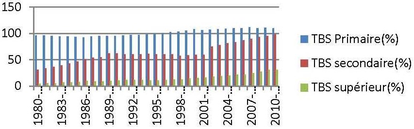 Ainsi, nous notons que les taux nets de scolarisation entre le primaire et le secondaire se sont maintenus autour de 95%, de même pour la Corée du sud ; par contre pour la France et la Finlande, ils ont diminué de 4% chacun. Pour le Maroc et l’Afrique du Sud, ils ont baissé de 40% chacun. Cependant, le TBS de l’enseignement supérieur en Chine, pays émergent, ne dépasse pas les 17% pour une période de dix ans, entre 2000 et 2011. Sa politique de démocratisation de l’éducation concerne en priorité le primaire.