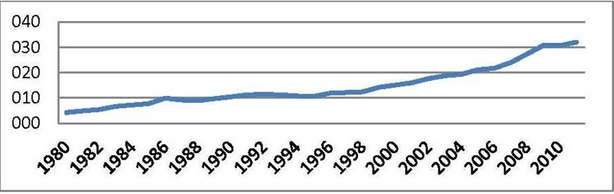 Mais quoique qu’il en soit, le nombre de diplômés universitaires en Algérie ne dépassait pas les 3,4% en 2000 et 5,4% en 2010 (graphique 6). Ce taux reste en deçà de celui du Maroc (6%), celui de la Tunisie (6,2%) et celui de l’OCDE (14,50%).
