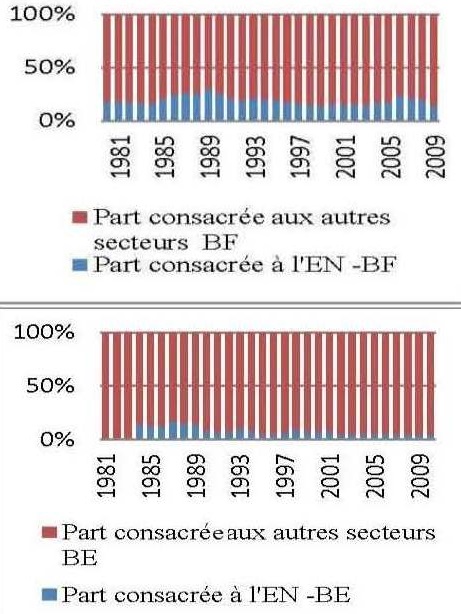 Dans l’ensemble, la priorité accordée à l’éducation nationale dans le cadre du budget national n’a pas changé. Cependant, la part du budget de fonctionnement de l’éducation nationale qui représentait environ 18% en 1980 a évolué à 23,50% en 2007 puis seulement à 13,76% en 2010 du total des dépenses de fonctionnement de l’état. Par contre, celle du budget d’équipement, est passée de 1% en 1980 à 4,41% en 2010 (graphiques 4 et 5).