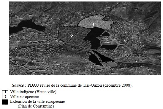 Notons enfin que cette Z.H.U.N, de l'avis même des concepteurs du plan directeur d'aménagement et d'urbanisme (P.D.A.U) de la commune de Tizi-Ouzou, dédouble de façon identique la ville de fondation coloniale, c'est-à-dire en reprenant la même configuration que cette dernière même si des différences existent sur le plan urbanistique. L'ancienne ville est dominée de constructions coloniales dont la surface bâtie représente 60% de la surface totale avec 26% de la surface des îlots réservée au commerce. Quant à la ville nouvelle, elle est composée de grands ensembles d'architectures fonctionnalistes qui occupent 11,8% de la surface totale avec 2% de surface commerciale[3].