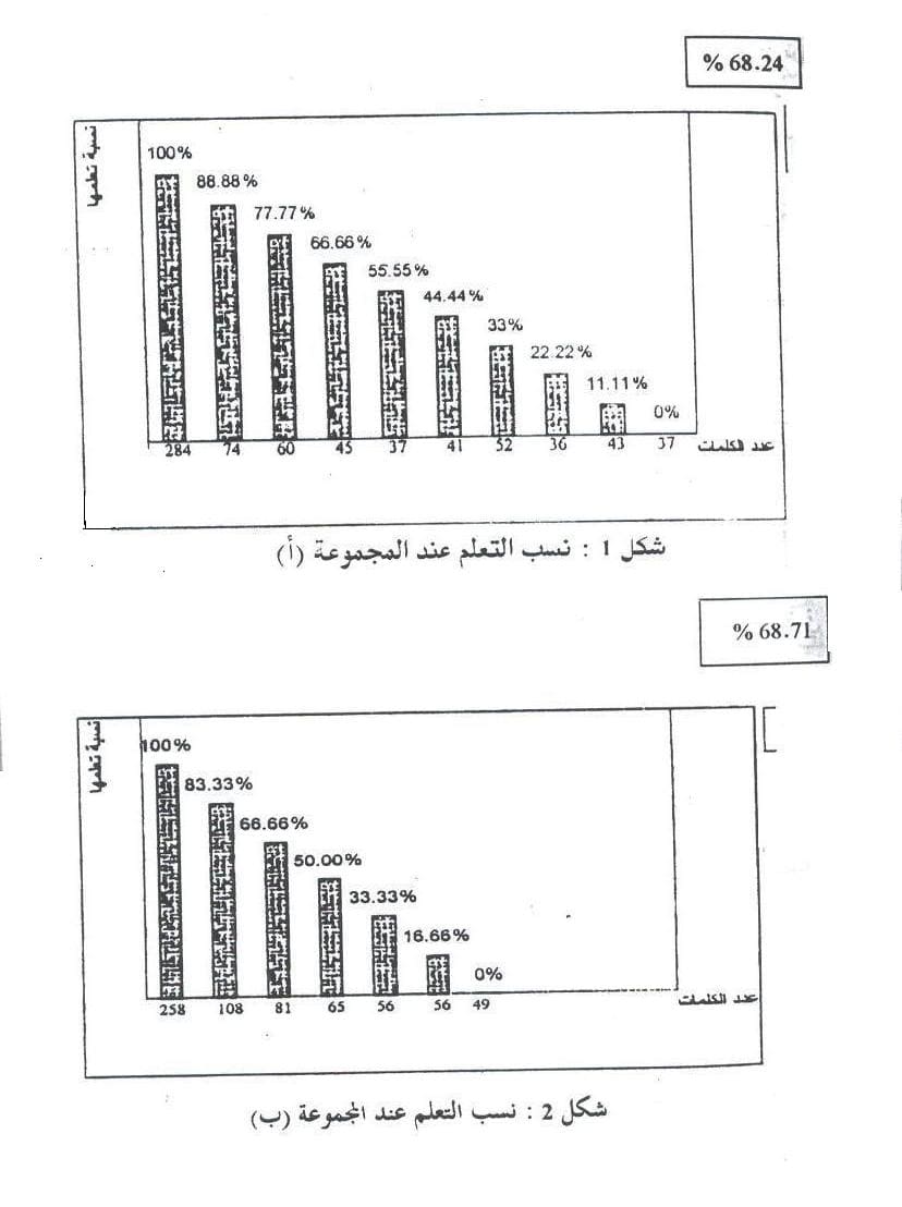 تؤكد النتائج الموضحة في الشكلين (1) و (2) ما كنا قد توصلنا إليه سابقا من أنه لا أثر للالتحاق برياض الأطفال على التحصيل اللغوي لتلاميذ السنة الأولى من التعليم الأساسي[17]، إذ أن معدلي التعلم، معدلان متقاربان جدا قدرا بـ : 68.24 عند المجموعة (أ) و 68.71 عند المجموعة (ب).