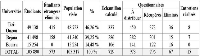 Les données qui ont été utilisées dans cette étude[1] sont tirées d’une enquête réalisée en 2015 sur une population de jeunes étudiants des universités de Tizi-Ouzou, Bejaïa et Bouira. Cette recherche s’était appuyée sur une approche socio-anthropologique ainsi que sur une méthode dite mixte (Condomines, B et Hennequin, E, 2013, p. 18) qui s’était articulée autour de deux techniques d’échantillonnage non probabilistes. D’un côté, une méthode boule de neige, qui avait permis de réaliser des entretiens auprès de 15 jeunes étudiants, et de l’autre, un échantillonnage par quota, à travers lequel environ 1000 questionnaires avaient été distribués de manière à ce que l’échantillon sélectionné puisse être représentatif[2] de la taille de la population visée selon chaque université.