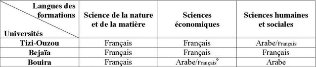 Globalement, l’investigation menée auprès des jeunes étudiants des universités de Bejaïa, Bouira et Tizi-Ouzou a démontré que les formations en sciences de la nature et en sciences de la matière sont assurées en langue française, alors que celles relatives aux sciences humaines et sociales sont dispensées en langues arabe ou française, selon les universités[7]. Bien entendu, excepté les classes de droit, où on enseigne en arabe, et les classes de langue, où les langues de formation sont spécifiques à la formation en question.
