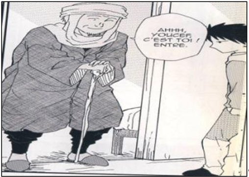 Le grand-père en visite est habillé, comme l’indique le plan moyen sur l’image 6, de manière traditionnelle : aamama, ebaya, khizrana. Il amènera d’ailleurs avec lui un poulet pour la fête du Mouloud (ceci n’apparait pas sur cette image mais on le voit plus loin dans le manga au niveau de la page 52). Tous ces éléments font du grand-père le garant et le représentant des traditions. Il porte la moustache grisonnante et les rides, sous forme de traits, elles apparaissent au niveau du front et sous les yeux. L’image représentée ici est celle du Chibani cheikh qui inspire le respect.