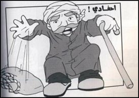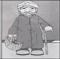 D’abord, à travers les rides sur son visage (par le biais de traits dessinés à côté des lèvres et du front), ensuite, à travers les vêtements[9] (Lodge, 2009, p. 112) traditionnels qu’il porte (aabaya, aamama …) et la canne khizrana sur laquelle il s’appuie. Etant celui qui transmet le passé, son histoire et celle de son pays, il renvoie ainsi au chibani cheikh, posé, qui possède des connaissances et, de ce fait, il est celui qu’on écoute.