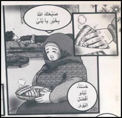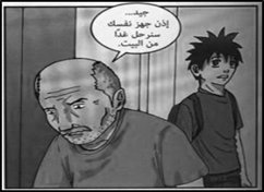Le grand-père est représenté comme étant quelqu’un qui aime beaucoup ses petits-enfants. Ainsi, dans l’image 7, dès qu’il les voit, il jette son couffin (comme l’indiquent les traits qui relient la main droite du personnage au panier) et crie « ! أحفادي  » (mes petits-enfants !) et ce, afin de les prendre dans ses bras. Il n’y a pas de retenue dans ce geste, il les aime et le montre. L’auteure donne ainsi l’image d’un grand-père aimant et démonstratif.