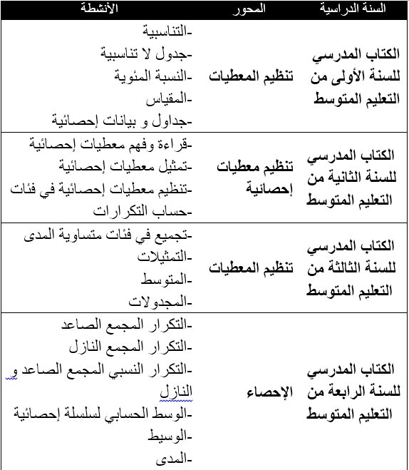 L’écart temporel : en effet, l’élève se trouve face à une rupture dans l’apprentissage de la statistique d’une année à l’autre et nous constatons une répartition inéquitable dans les contenus car ces derniers ne sont pas les mêmes en terme de quantité ou en terme de difficultés. Ainsi, par exemple, certains éléments de la première année ne seront qu’un lointain souvenir au moment où l’enseignant commence des cours de statistique de la deuxième année (cela est expliqué par la programmation tardive des cours de statistique à la fin de l’année scolaire qui rendent cette discipline facultative par rapport aux mathématiques).