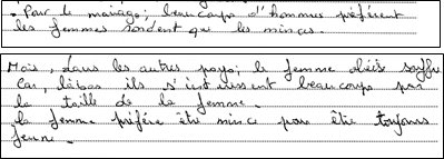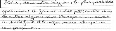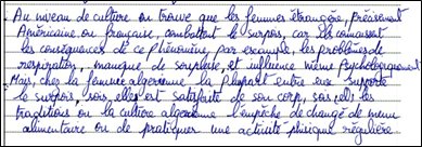 Grâce à ses compétences en matière de littératie et de construction de sens, l’étudiante 9 évoque l’idée de rondeur que préfèrerait le sexe opposé en comparant cette représentation sociale à celle d’une autre sphère culturelle différente qui présente un culte du corps mince, symbole de jeunesse et d’élégance.