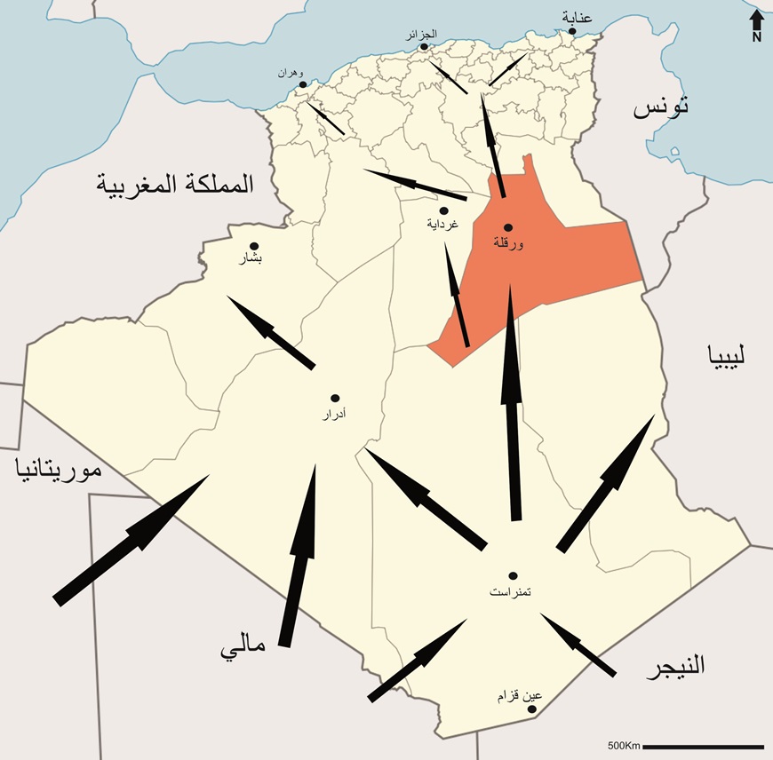 من بين أهم المدن التي تستقطب اليوم أعدادا كبيرة من هؤلاء المهاجرين، من مالي والنيجر والعديد من الجنسيات الإفريقية الأخرى، والتي طالما كانت على خريطة مسار هجرة مواطني دول ساحل الصحراء، مدينة ورﭬلة (800 كلم جنوب العاصمة الجزائرية) والتي تحولت في السنوات الأخيرة إلى مستقر لمئات من الأفارقة، إذ تتحدث بعض التقديرات عن 2500 إلى 3000 منهم في ورﭬلة  وغرداية سنة 2005[4]. أما في واقع اليوم فهم أكثر من ذلك بكثير، يقدّرهم الهلال الأحمر الجزائري بـ 5000 إلى 6000 من مواطني دول ساحل الصحراء أغلبهم من مالي والنيجر، لكنّ هذه الأعداد غير ثابتة تتغير أسبوعيا بل حتى يوميا نتيجة حركتهم ذهابا وإيابا.
