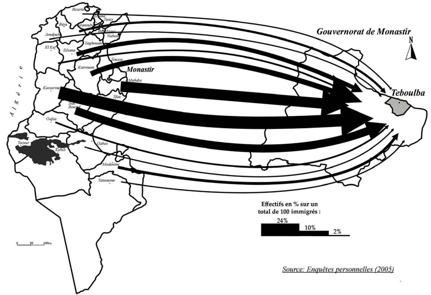 [30] À l’échelle de la Tunisie, ces migrations saisonnières « sont symptomatiques d'un double processus. D'abord la crise générale que connaît le pays notamment en matière d'emploi fait qu'à la migration classique, définitive, mais en baisse, s'est ajoutée la migration saisonnière dans le cadre d'une stratégie familiale de fixation et de pluri-activité. Ensuite, ces courants migratoires concernent le Nord-Ouest et le Centre-Ouest et sont en direction du Nord-Est et du Centre-Est et faiblement vers le Sud » (Belhedi A., 2000).