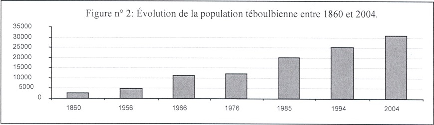 Au lendemain de l’indépendance du pays, en 1956, le Sahel était une région répulsive ; mais « le renversement et la consolidation de son bilan migratoire sont les principales modifications survenues dans les migrations internes régionales depuis les années 60 » (Lamine R. et Boubakri H., 1995, p. 83). Téboulba participe tout à fait, du fait de son dynamisme économique et démographique, à cette évolution. En effet, la population de la ville a d’abord doublé au cours de la décennie 1966-1976 ; puis son taux de croissance s’est maintenu à un niveau élevé (5,76%) entre 1976 et 1986, avant de faiblir durant les dernières décennies pour tomber à 2,08 % entre les deux derniers recensements (1994 et 2004), soit à un taux qui représente à peine le double du taux d’accroissement naturel de la Tunisie en 2004 (1,08 %). L’histogramme de l’évolution de la population téboulbienne entre 1860 et 2004 illustre cette évolution.