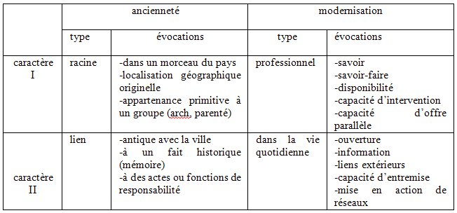 L’allocation de sens accomplissant une sélection d’aspects dans le fait rural, ce dernier est loin d’être mis en tous points en situation de discrédit. Il réapparaît pour prendre place dans la signalétique sociale en vogue. Opérant à côté de l’adaptation au temps présent, la qualité d’ancienneté mentionne à la fois enracinement à un terroir et lien à la «ville»[31]. De son côté, juxtaposée au passé, l’inscription à son époque associe situation professionnelle et vie quotidienne. Elle attire tout aussi l’attention sur les deux attributs: nouveaux acquis et capacité d’intervention. Le rappel du temps passé exhibe la concordance campagne/ville. Les reniements liés à l’accommodation au temps présent soulignent la cohérence privilèges récents/utilité sociale disponible. De ces équilibres, employés à laisser paraître une trajectoire recevable, on attend un ajustement au statut social modèle. Certains antécédents, emplacement autorisant capacité d’offre et mobilisation de réseaux de relations trouvent matière à conjugaison dans ce statut, point de convergence de nombreux attributs. (Cf. tableau 1)
