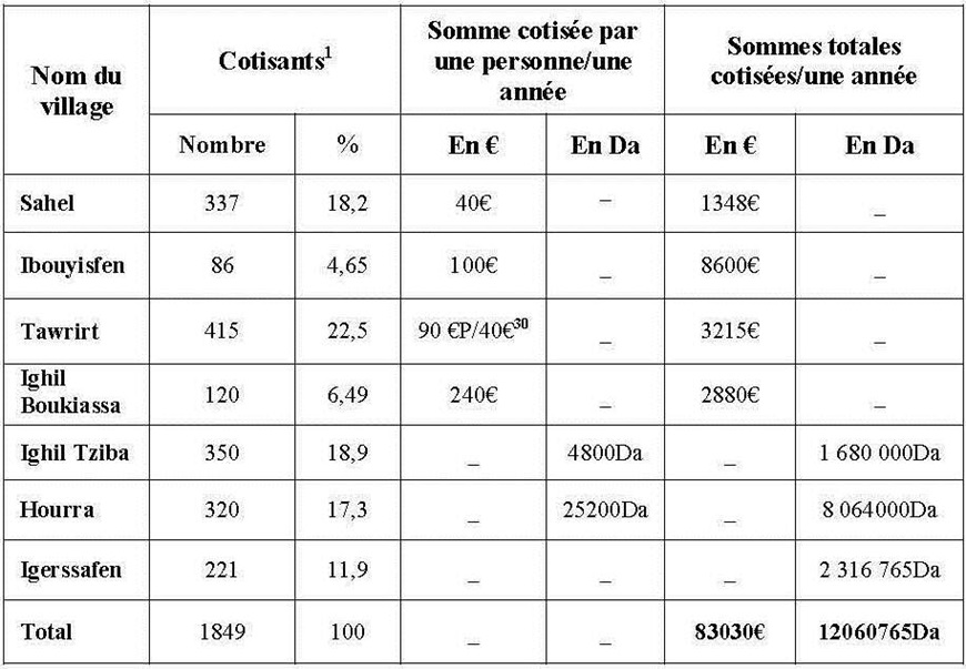 31 Ces données nous ont été fournies par les membres des comités de villages qui nous ont expliqué leurs systèmes des cotisations, notamment le nombre des cotisants et le montant des cotisations par personne. Nos calculs nous ont permis de réaliser ce tableau. Nous disposons d’autres données sur les systèmes de cotisation concernant d’autres villages de la région mais qui ne nous permettent pas de calculer la somme totale provenant de ces cotisations (nous n’avons pas le nombre exacte des cotisants). Par exemple les émigrés du village Ikoussa cotisent 40 euros par an, les émigrés du village Tazrout cotisent 10 euros par mois et ceux du village Ath Iken cotisent 100 euros par an (les retraités cotisent 30 euros par an)…