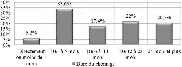 Le témoignage de cette jeune diplômée n’est pas singulier. Ainsi, 55,5 % des diplômés universitaires interrogés à la recherche d’un emploi indiquent que c’est en premier lieu le manque de propositions de travail qui complique leurs démarches de recherche d’emploi. De plus, selon les données qu’on peut observer dans la figure no 1, il n’y a que 39,8 % des enquêtés qui ont pu décrocher un travail en moins de six mois après l’obtention de leurs diplômes. Le reste des enquêtés, qui représente la plus grande part, n’ont pu le faire qu’après une durée qui a dépassé les six mois, et dont 42,7 % peuvent être comptabilisés dans un chômage de longue durée.