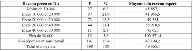 Dans un troisième lieu, le sentiment de malaise des jeunes diplômés, en rapport avec leur situation dans le marché de l’emploi, est aussi lié au niveau de leurs revenus. Qui, comme il est affiché dans la table no 1, se situent selon cette enquête à 6,8 % en dessous de 10 000 dinars, à 21,9 % entre 10 000 et 20 000 dinars et à 18,3 % entre 20 000 et 30 000 dinars. Des revenus en dessous de leurs espérances, puisque toujours selon cette étude, cette catégorie de jeunes aspire à un revenu qui, en moyenne, avoisinerait les 50 000 dinars. Or, parmi les 17,7 % des cas qui ont un revenu qui dépasse les 30 000 dinars, il n’y a que 3,8 % qui surpassent ce seuil moyen d’aspiration.