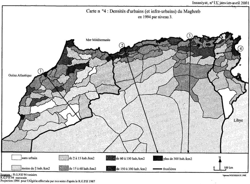 Source : R.G.P.H. marocain et tunisien de 1994 ; Vanessa Rousseaux 1999 et projection algérienne pour 1994 d’après le R.G.P.H. 1987 réalisée par mes soins.