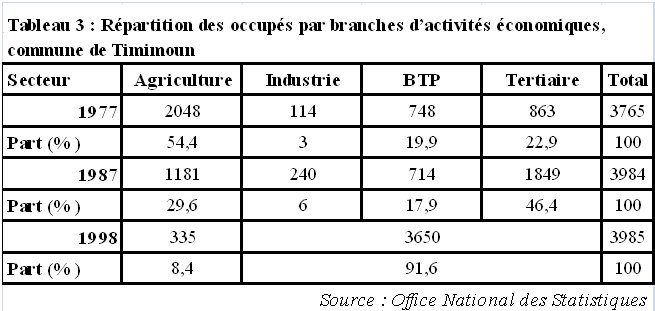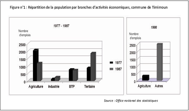 L’agglomération a connu une croissance démographique importante de 1966 à 1987. La croissance annuelle moyenne est passée de 4,3% pour la décennie 66-77 à 5,3% pour la suivante. Le fort accroissement enregistré sur la seconde période peut être expliqué par la natalité qui a caractérisé tout le territoire national ainsi que par l’apport extérieur des oasis de l’ensemble du Gourara comme de la sédentarisation des nomades des Hautes plaines steppiques. Timimoun s’est imposée historiquement comme le centre dynamique du Gourara et son rôle a été renforcé, ou conforté, par sa promotion en 1974 en chef-lieu de daïra, au sein de la nouvelle wilaya d’Adrar créée la même année. Cette promotion lui a permis de se doter en équipements et en infrastructures inhérents à ce rang administratif.