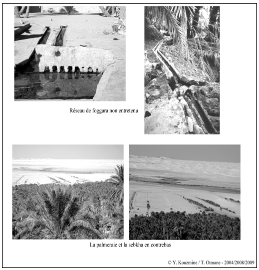 Un nombre de 21 foggaras totalisant 53 km de galeries souterraines traverse le tissu urbain du sud-est au nord-ouest et capte l’eau de la nappe du Continental intercalaire. Conséquence du rabattement de la nappe, le volume d’eau mobilisé par les foggaras est en diminution et les superficies des jardins irrigués en contrebas se réduisent également (photographies n°3).