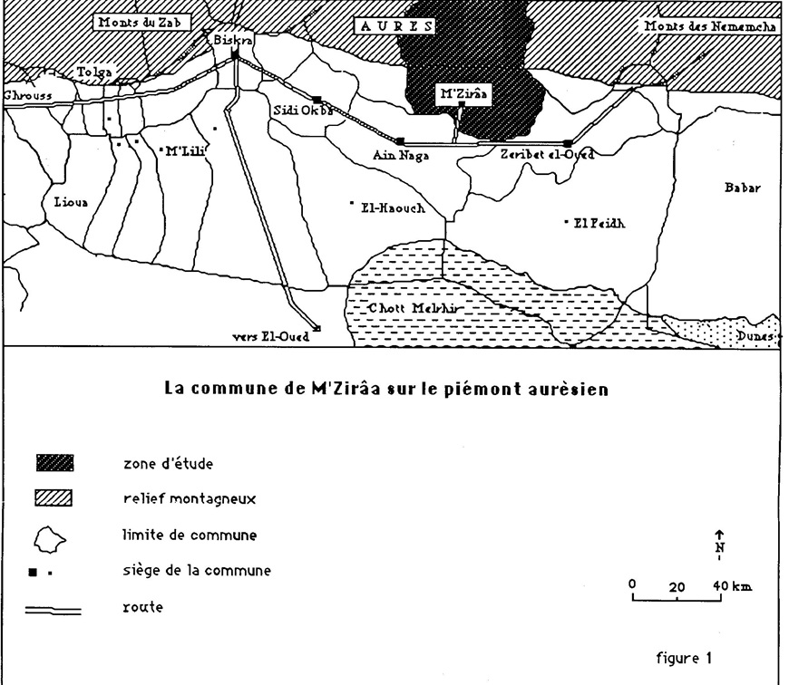 M’Zirâa, commune située au pied des derniers contreforts des Aurès, n’attire guère l’attention du voyageur qui parcourt la route allant de Biskra à Zeribet el-Oued en longeant le Piémont sud-aurassien. Celui-ci ne peut imaginer qu’au delà, à moins de 6 km au nord de la route et au pied même des derniers contreforts des Aurès rougeâtres et dénudés, sont localisés plus d’un millier de jardins irrigués verdoyants, produisant une riche gamme de maraîcher (cf. fig. 1).