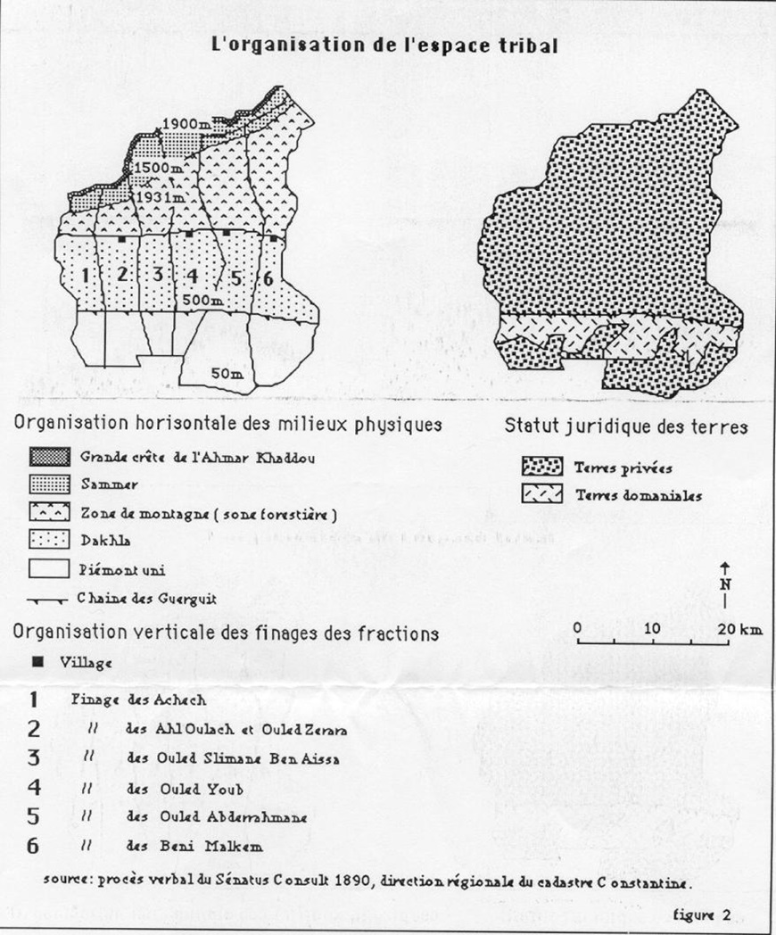 A cette organisation horizontale des milieux physiques, se superpose perpendiculairement l’ancienne organisation sociale formée des 6 fractions qui composent la commune de M’Zirâa. En effet, le territoire de la commune est occupé successivement d’est en ouest par les Beni Melkem, les Ouled Abderrahmane, les Beni Slimane Ben Aïssa, les Ahl Oulach, les Ouled Zrara, et les Achach, fractions issues de l’ancienne tribu de l’Ahmar Khaddou ; chaque fraction occupe un territoire qui s’étale sur les trois milieux physiques, d’où la forme longitudinale des finages de ces fractions (cf. fig. 2).