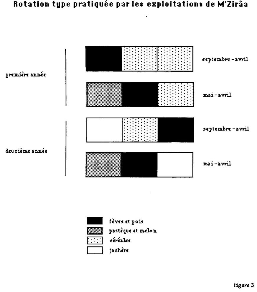 Le jardin-type est souvent divisé en trois soles: 1/3 est consacré aux céréales (généralement du blé), l/3 aux cultures maraîchères de plein champ, essentiellement des fèves et petits pois cultivés en automne, pastèque et melon cultivés au mois d’avril, et 1/3 laissé en jachère ; ce dernier est occupé pour 1/4 par la plasticulture. On rencontre cependant quelques arbres fruitiers et même des palmiers dans la plupart des exploitations. La rotation est pratiquée ici dans toutes les exploitations et la superficie du jardin, couverte entièrement par les cultures en première année, laisse 1/3 en jachère l’année suivante.
