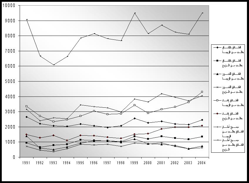البيان الإحصائي رقم 4. تطوّر أحكام الطلاق (بأنواعه الثلاث) الصادرة من المحاكم التونسية بطلب من الزوجة وبطلب من الزوج بدءا من 1991 إلى 2005.