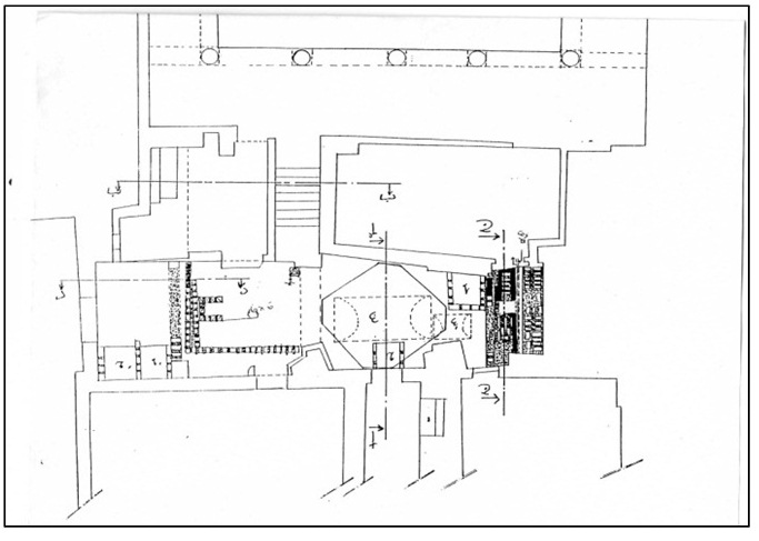 Fig. 6 : Relevé archéologique du bain du palais Aziza Bey. Identifiant la voûte en berceau dans la chambre chaude ainsi que des bassins d’eau.