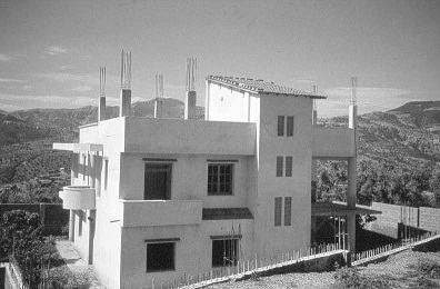 Un glissement volontaire a été opéré dans la traduction spatiale du travail de A. Sayad. Celui-ci place le troisième âge dans le territoire d’accueil dans lequel l’émigré transfère certaines marques de son milieu d’origine. Ici nous nous intéressons à ce qui se passe chez les Ath-Waghlis, aussi avons-nous trouvé le troisième âge dans cette maison apparue dans les années quatre-vingts, en dehors du tissu villageois dans les champs autrefois espace nourricier, le salariat rendant facultatif, tout au plus un appoint, le travail agricole. Cependant la logique de production de ces conditions étant la même, nous pensons être dans l’esprit du travail de A. Sayad. La deuxième raison de ce glissement réside dans la tranche chronologique du travail produit à la fin des années 70, antérieures à la maison construite dans le champ et qui annonce des nouveaux rapports de voisinage autrefois restreints à la cellule familiale la plus proche, Aujourd’hui ceux-ci sont déterminés par la logique économique qui définit le voisin le plus proche comme étant le propriétaire du champ le plus proche. Caractère déterminant de la maison du troisième âge auquel le nouveau style architectural donne une empreinte qui marque une rupture formelle avec la maison traditionnelle en même temps qu’elle inscrit celle-ci dans le sillage d’un modèle qui se voudrait national.