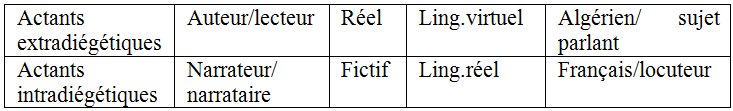 • Premièrement le lecteur/ interlocuteur français partage avec l’auteur la connaissance du code de l’énonciation, mais pas les deux autres, qui sont spécifiques à l’Algérie.