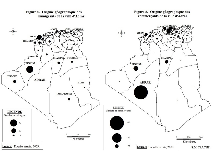 Trois entités géographiques se dessinent à travers la lecture des figures n°5 et n°6 : la région algéroise se distingue avec la capitale Alger, Tizi-Ouzou et Bouira qui détiennent l’essentiel du commerce adrarien; viennent ensuite la région oranaise et enfin la troisième entité, le Sud algérien, représenté par Béchar et Ghardaia.