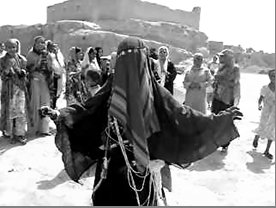 [21] لباس تقليدي للعروسة ، يحوي ثلاث قطع قماش ملونة:  القطعة الأولى من اللون الأحمر تحجب الوجه حتى لا يظهر، القطعة الثانية من اللون الأخضر وتوضع على الكتفين، القطعة الثالثة وهي لباس باللون الأسود ترتديه العروسة  كمرحلة أولى، إضافة إلى حزام باللون الأبيض، كما تتزين العروسة  بالحلّي المصنوعة من الفضة. أنظر الصورة رقم 05.