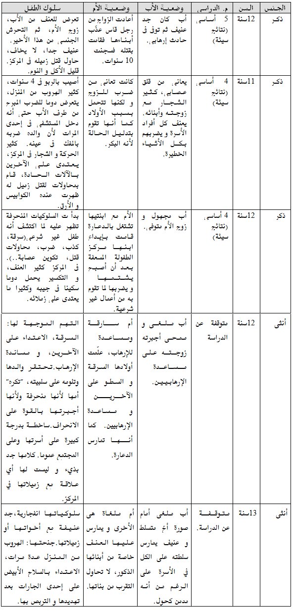 • كل الحالات لم تنعم بالجو الأسري الدافئ و المستقر كما أنها لم تقم علاقات تواصلية قارة و مستقرة مع بقية أفراد الأسرة، وما ظهر عندها هو عدم ثبات الصور الوالدية سواء ماديا أو معنويا و لهذا لم يستطع هؤلاء الأطفال إدراك انتظارات الوالدين لأنهما (أي الوالدين) لم يكونا بالثبات و الديمومة اللازمة لتقديم صورة معرفية واضحة للأبناء تسمح لهم بتقييم سلوكياتهم أو تصنيفها و لم يعد بمقدورهم معرفة الخطأ من الصواب.