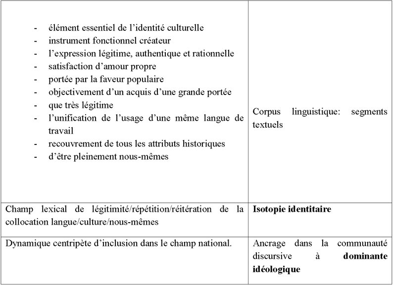 En effet, le regroupement des segments textuels qui le composent  révèle une cooccurrence d’isotopies sémantiques reconstruites à partir de champs lexicaux producteurs des sens discursifs sous-jacents et qui distinguent bien les fonctions et rapports que la langue doit entretenir dans ces trois dualités : catégorie isotopique identitaire / communauté à dominante idéologique ; catégorie isotopique autonymique / communauté à dominante institutionnelle ; et catégorie isotopique de la modernité / communauté à dominante universelle, comme illustré dans le tableau suivant : ci-dessous les trois champs isotopiques.