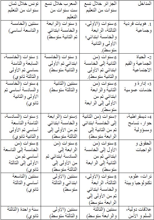 ب- يبدأ الطفل منذ السنة الخامسة أساسي بمعرفة الأساسيات المرتبطة بالحياة المشتركة(التضامن والقيم الاجتماعية) كما رأينا بالنسبة للمدرسة، العائلة والأمة، لكن أيضا من خلال المخاطر والحماية مثل(حوادث الطرقات...)، احترام الجار والممتلكات. تظهر مسألة الهوية من جديد في السنة السابعة أساسي بفضاءاتها الاجتماعية الثلاثة المتمثلة في العائلة، المدرسة والمجتمع، من الثامنة أساسي تبدأ مشاركة التلميذ في الحياة العامة خصوصا داخل المدرسة، ثم في السنة الأولى ثانوي المشاركة في الحياة الثقافية والسياسية. في حين تُتناول مسألة مكافحة الفقر في السنة الثالثة ثانوي كَتَحَدِّ من بين التحديات العالمية.