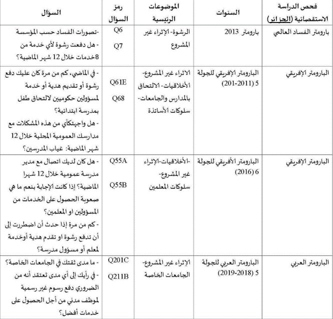 يوضح الجدول أعلاه نموذجا من الدراسات الاستقصائية الخاصة بدولة الجزائر حول الممارسات الفاسدة في التعليم ضمن خريطة قاعدة البيانات المحددة وفق المنهج الذي حدده المعهد الدولي للتخطيط التربوي لمنظمة اليونيسكو، والتي تبرز بأنها خضعت لثلاثة بارومترات[38] (عالمية، إفريقية (خلال جولتين) وعربية(، على اعتبار أنها إما متزامنة أو مختلفة دوريا، مع التأكيد على أنه ليس النموذج نفسه بالنسبة لبقية دول العالم، فمثلا نجد أن تقرير الشفافية الدولية في بارومتر عالمي لعام 2013 هو المصدر الأساسي للسياسات الوطنية للدولة محل البحث والذي يختلف عن نظيره على المستوى الإفريقي أو العربي. ومن جهة أخرى إذا كان هذا النموذج الاستقصائي قابلا للتطبيق في مجال التعليم ككل دونما تمييز في النوع يتعين ألا يخرج عن نطاق تلك الأسئلة عندما نحاول البحث فيه عن فئة النساء والفتيات في حيز جغرافي معين، مثلما سنبرزه في مخططنا أدناه: