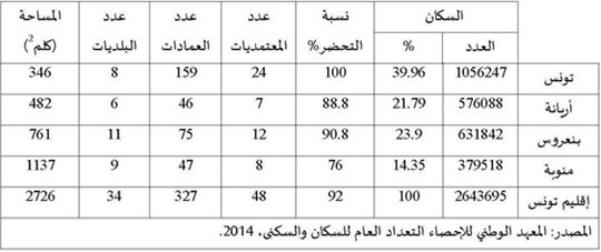 [9] يقدر عدد السكان غير البلديين بإقليم تونس في سنة 2014 بقرابة 214.000 نسمة (المعهد الوطني للإحصاء، تعداد سنة 2014).
