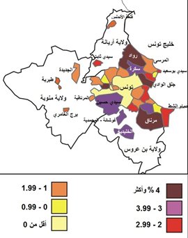 خريطة رقم 4: المعدل السنوي لنمو سكان بلديات إقليم تونس بين سنتي 2004-2014