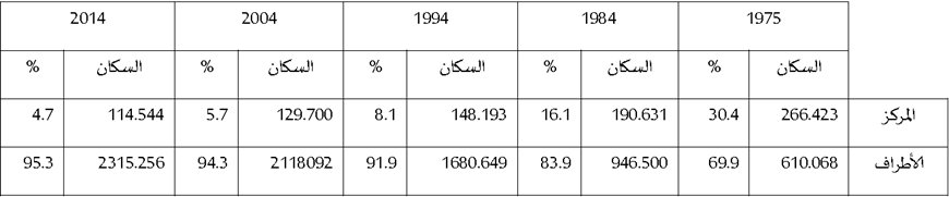 جدول رقم 5: تطور الوزن النسبي للسكان حسب المجال المركزي الرئيسي والأطراف بين 1966 و2014