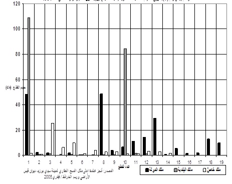 3ـ ملك الدّولة: في نفس الوقت الذي سجّلت فيه مساحة الأرض الحضرية التي تعود ملكيتها للخواص زيادة بحوالي 150 هكتارا خلال الفترة 1984-2004 توزّعت أساسا بين أحياء: الورود، القوافل، الرّوابي، الحدائق، المستقبل والنّور الغربي (انظر الخريطة رقم2)، كانت بقيّة المساحة التي التهمها التّوسّع الحضريّ تابعة في مجملها إلى أملاك الدّولة. يعني ذلك أنّ مساحة المجال التي توسّعت لتبلغ 1073 هك سنة 2004، قد أصبحت متركّبة من 217 هك من الملك البلدي و225 هك من الأملاك الخاصّة والبقيّة من ملك الدّولة. أي إنّ الفارق بين إجماليّ مساحة المدينة وكلّ من مساحتيْ الملك الخاصّ والملك البلديّ هي مساحة أملاك الدّولة (631 هك) استغلها أغلب الأدفاق السّكّانيّة الوافدة عليها.