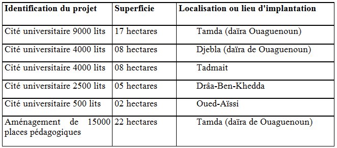 Le tableau 3 identifie la liste des équipements publics de portée régionale programmés dans le cadre du Plan quinquennal (2005-2009) et implantés hors du territoire de la commune de Tizi-Ouzou.