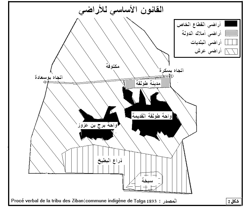 - فالمستثمرات الحديثة ذات الأشكال الهندسية (شكل 3) التي أنشئت في إطار قانون حيازة الملكية في محيطات ذراع البطيخ والمكتوفة، تحقق أرباحا تفوق أضعاف المرات أرباح المستثمرات التقليدية. فتنوع المحاصيل الزراعية في المستثمرات الحديثة (نخيل، زراعات محمية)، والمردود العالي للنخيل الجديد (80 إلى 100كغ/للنخلة الواحدة)، دحرج منتوج التمور في الواحة القديمة، التي تعاني من شيخوخة نخيلها، وقلة مياه السقي فيها، وإهمال صيانة السواقي والنخيل، والتخلي عن استعمال الغبار لتخصيب الأرض منذ أكثر من عقدين، لارتفاع أسعاره، مما أدى إلى التقهقر الكبير في الإنتاج وفي نوعية المنتوج (25 إلى 35كغ/للنخلة الواحدة). كما أن المحاصيل الخضرية التي كانت تشكل الطابق الأول للغلال التي تغرس تحت الأشجار، قد تخلي الفلاحون عنها منذ مدة، بعد أن غزت منتوجات البيوت البلاستيكية أسواق الزيبان، وباتت مداخيل المستثمرات التقليدية تقتصر على النخيل، وهي مداخيل جد متواضعة.