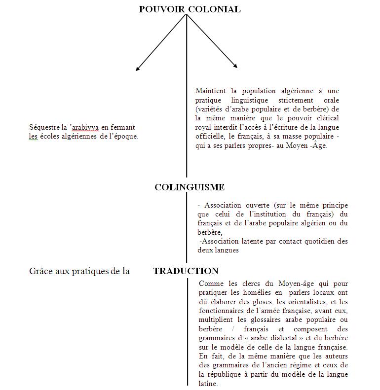 Association, par les pratiques de la «traduction» et de la «grammatisation» (= dans le sens de Balibar, «formation grammaticale commune à tous les citoyens»), des parlers arabes et berbères de l’Algérie en français sur le schéma médiéval qui donna naissance aux serments de Strasbourg, «premier texte officiel, acte de naissance de la langue d’Etat dans la France» et à l’institution de la langue française dont le principe est «sa possibilité d’être traduite intégralement dans une autre langue de l’appareil ou un autre état de langue historique reconnu dans l’appareil».