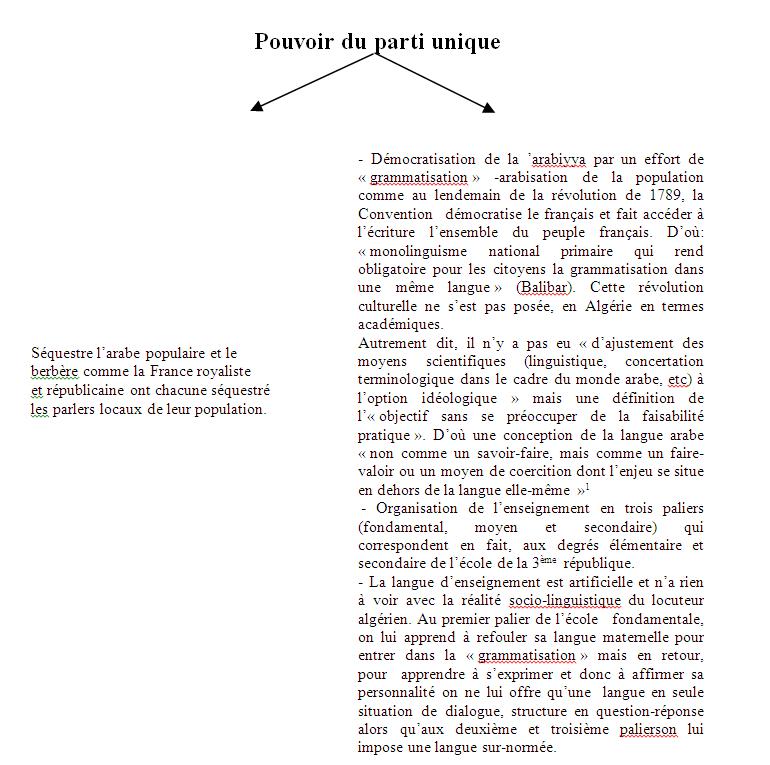 Le principe démocratique qui «rend obligatoire pour tous les citoyens la grammatisation dans une même langue» est «violé en pratique lorsque la masse du peuple ne peut pas accéder aux degrés supérieurs de l’instruction». Si en France l’école élémentaire interdit l’exercice de la traduction, refuse donc «l’appropriation raisonnée des lois des langues qui tend à la création de l’esprit critique chez les élites»[5], en Algérie, les second et troisième paliers de l’école fondamentale enseignent un arabe «sur-normé», celui de l’âge d'or arabo-islamique que des «arabisants», conservateurs, nostalgiques du passé et défendeurs principaux du pouvoir éducatif, inscrivent au programme d’enseignement de la langue arabe.
