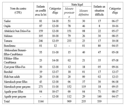 Suite à la réforme du nouveau Code de procédure pénale en 2002, des nouveautés ont été ajoutées à la loi actuelle parmi lesquelles figure la protection des enfants en situations de difficultés (articles 512 à 517). Auparavant, cette catégorie d’enfants était présentée aux tribunaux pour délit de vagabondage. À partir de 2002, nous remarquons que les statistiques des mineurs placés dans les centres de protection de l’enfance et les rapports des responsables distinguent entre les enfants en conflit avec la loi et les enfants en situation difficile. Or les deux catégories d’enfants sont placées dans les mêmes centres et partagent les mêmes activités, qui ont pour objectif la rééducation des enfants délinquants.
